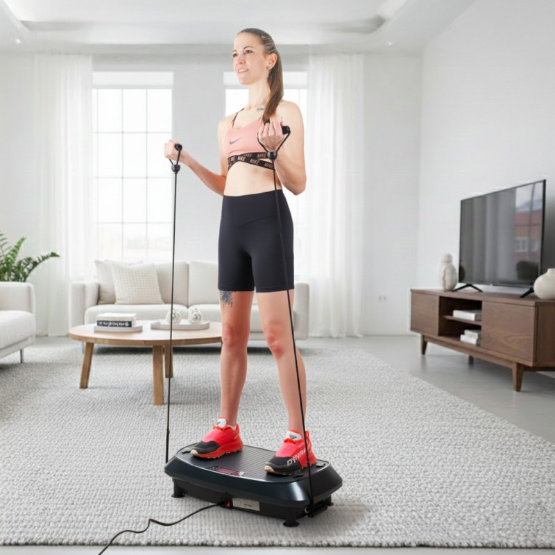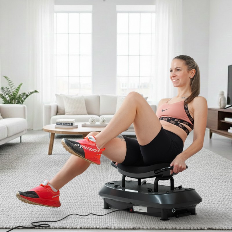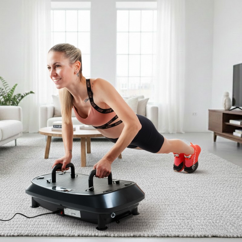 Platformă de vibromasaj cu două niveluri pentru mai multe exerciții, întărirea întregului corp și îmbunătățirea echilibrului. Dispune de 30 de viteze, vibrații 3D și un design compact și sigur, ideal pentru antrenamente acasă.