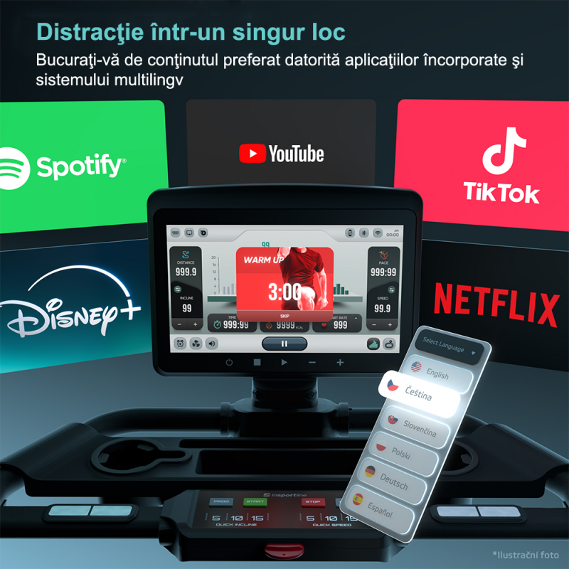 Aplicații preinstalate: YouTube, Netflix, Disney+, Amazon Prime Video, Facebook, Twitter, Instagram, Spotify, Kinomap, Zwift