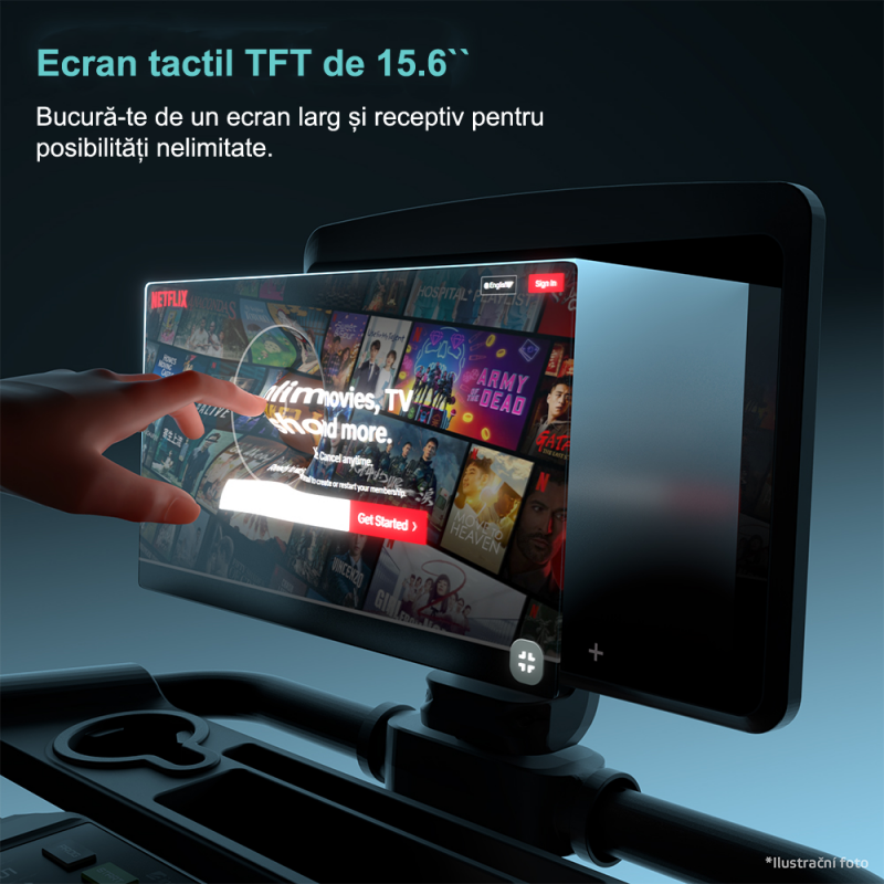 Experimentează antrenamente inteligente cu un ecran tactil rotativ de 15,6 inch, aplicații preinstalate – nu ai nevoie de telefon. Pliere ușoară, funcționare silențioasă, compatibilitate cu căști Bluetooth și 36 de programe pentru antrenamente eficiente