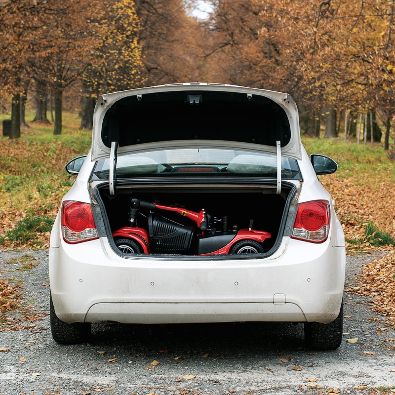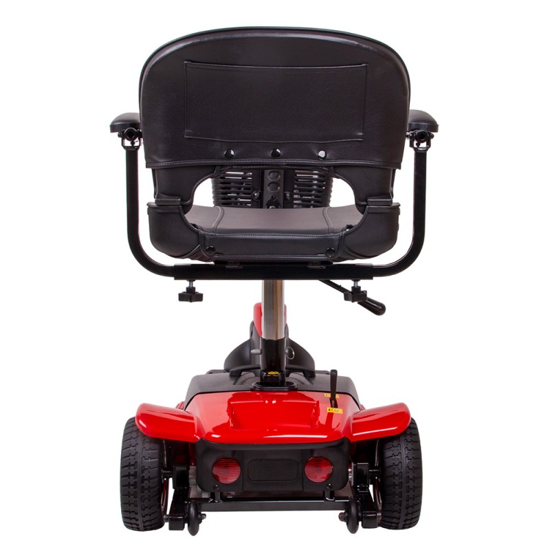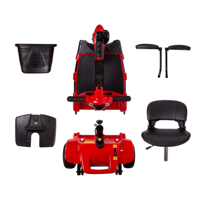 Dacă vrei să iei scuterul cu tine în vacanță, nu vei avea nevoie de spațiu suplimentar de depozitare – este suficient portbagajul mașinii tale. Scuterul poate fi dezasamblat în 4 părți separate, cea mai mare dintre ele cântărind doar 13 kg. Scaunul și ghidonul pot fi pliate, permițându-ți să muți scuterul cu ușurință dintr-un loc în altul, fără prea mult efort. În partea din spate a scuterului se află o manetă care permite unei a doua persoane să îl controleze manual.